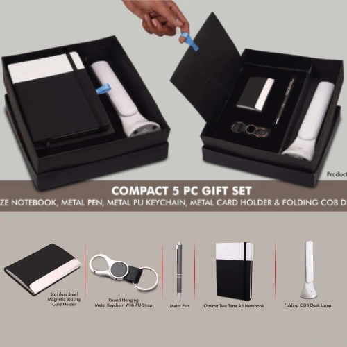 Compact 5 Pc Gift Set: A5 Size Notebook, Metal Pen, Metal Pu Keychain, Metal Card Holder & Folding COB Desk Lamp